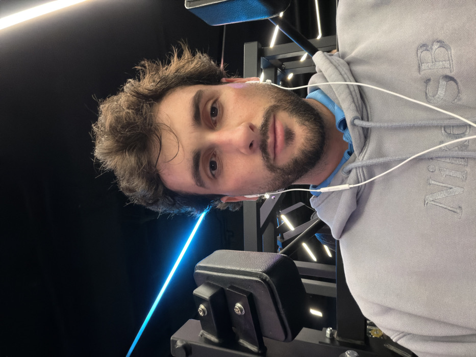 A person with curly brown hair, a beard, and headphones in their ears is facing forward. They are wearing a light gray hoodie. The setting appears to be a gym, with exercise equipment visible in the background. A bright blue light streak is also present. The image is slightly tilted.