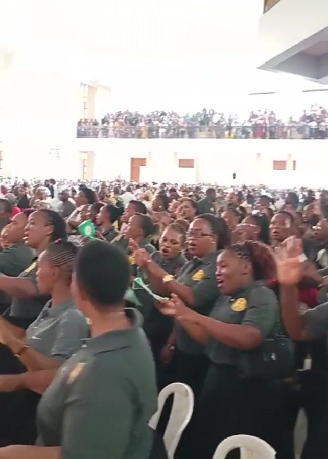 A crowd of people sing in a church-like setting, with many wearing matching gray shirts and black pants, facing forward. Some people have hands raised, and others are holding books or papers. A second level is visible with more people watching the scene below. The space appears to be well-lit, with a large roof overhead.