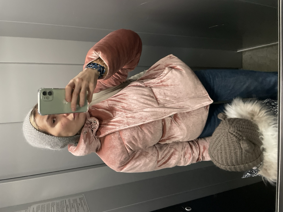A person in a pink velvet puffer jacket and gray beanie takes a mirror selfie with an iPhone