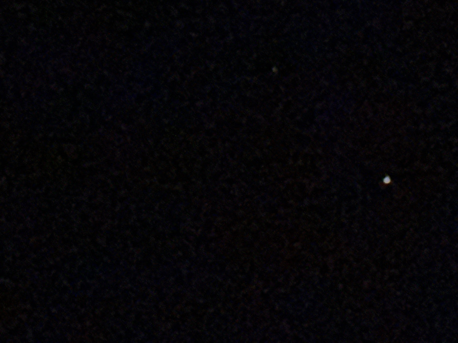 The image is predominantly dark, filled with a grainy texture that obscures details. Two small, bright spots are visible against this dark background, likely representing distant lights or stars. One spot is slightly dimmer and higher in the frame, while the other is brighter and positioned towards the lower right. The overall impression is one of sparse illumination within a vast, undefined space.