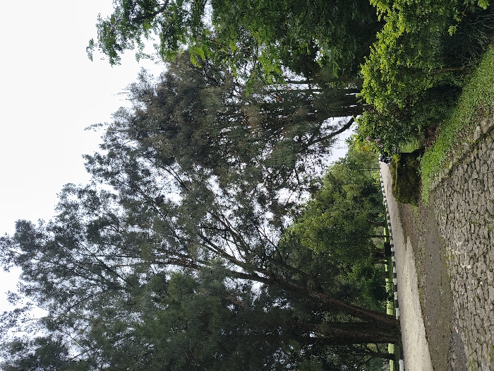A winding stone path leads through lush greenery, bordered by a mix of trees and shrubs. Towering trees with dense foliage create a canopy overhead, filtering the light. A concrete edge, marked with black and white stripes, separates the path from the vegetation. The scene evokes a sense of tranquility and natural beauty.