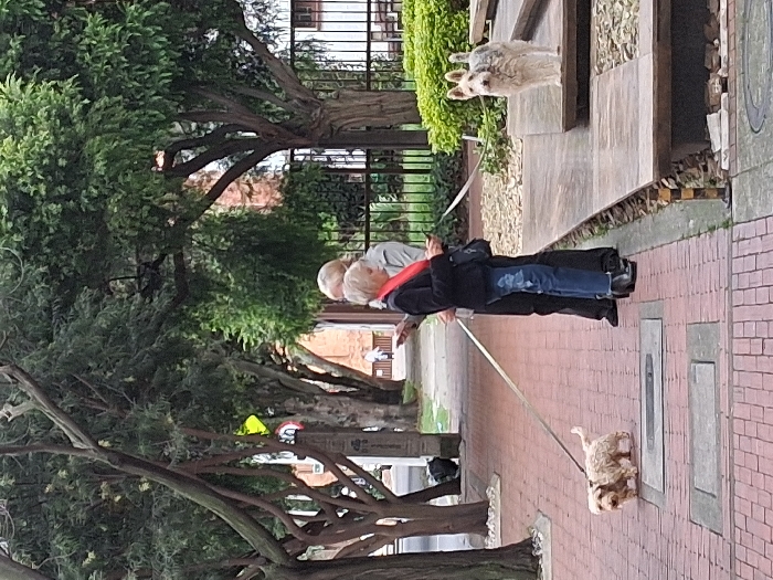 Two adults walk two dogs on a brick sidewalk alongside a green park. The first dog, white and furry, stands behind a building on a higher elevation than the sidewalk. The other dog, apricot-colored and shaggy, stands on the sidewalk and is leashed to one of the adults. The adults walk side-by-side and appear to be looking toward the camera. Trees line the sidewalk, providing shade.