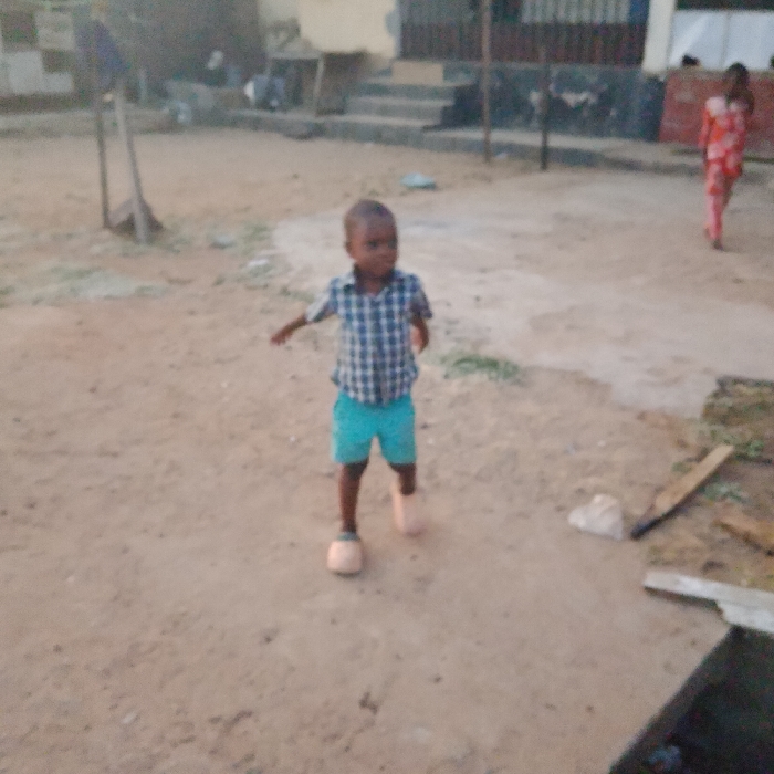 - "A young child stands on a dirt surface, wearing a blue and white checkered shirt and turquoise shorts, with pale footwear" by FM-bUtJ22, licensed under CC BY 4.0