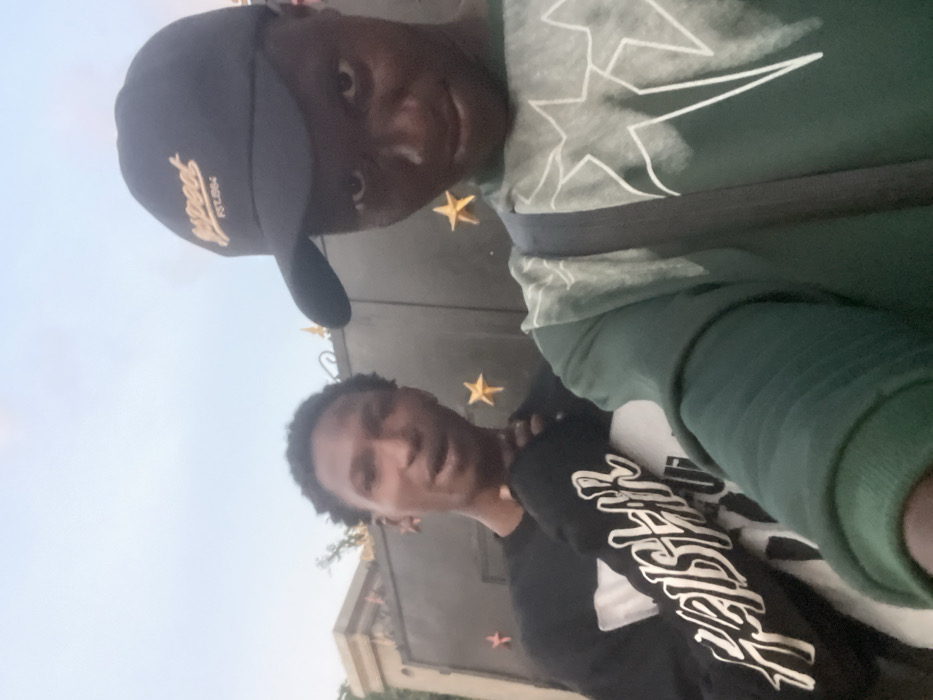 Two men are posing for a picture in front of a dark gate decorated with gold stars. The man in the foreground wears a black t-shirt with white writing on the sleeve. Behind him, the other man wears a green hoodie with white stars and a black baseball cap. The sky is visible in the background. The image is slightly tilted.