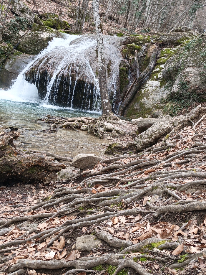 The image depicts a natural outdoor environment featuring a multi-tiered waterfall and forested terrain within a rural region designated as Unknown, Ukraine. In the foreground, numerous exposed, gnarled tree roots, varying in thickness, crisscross the uneven, soil-covered ground, which is largely blanketed by a dense layer of dry, brown deciduous leaves. Several light-colored rocks are embedded among the roots and soil. A pair of black-framed sunglasses rests on a horizontal, moss-covered log positioned near the left edge of the frame, adjacent to a small, clear stream. The midground is dominated by a waterfall cascading over a series of irregular, light-colored rock formations partially covered in green moss. The water appears turbulent and frothy white at the top of the fall, transitioning to clear, greenish-blue in the pool at its base. This pool feeds a narrow stream flowing towards the foreground. A slender, light-barked tree trunk stands vertically to the right of the primary waterfall drop, with visible roots at the water's edge. Additional moss-covered rocks and sections of fallen tree trunks are present on the banks surrounding the water. The background reveals a dense, deciduous forest composed primarily of bare-branched trees, suggesting a dormant season. Rocky outcrops with patches of green moss and sparse vegetation are visible on the slopes behind the waterfall. No human subjects or actions are visible within the frame.