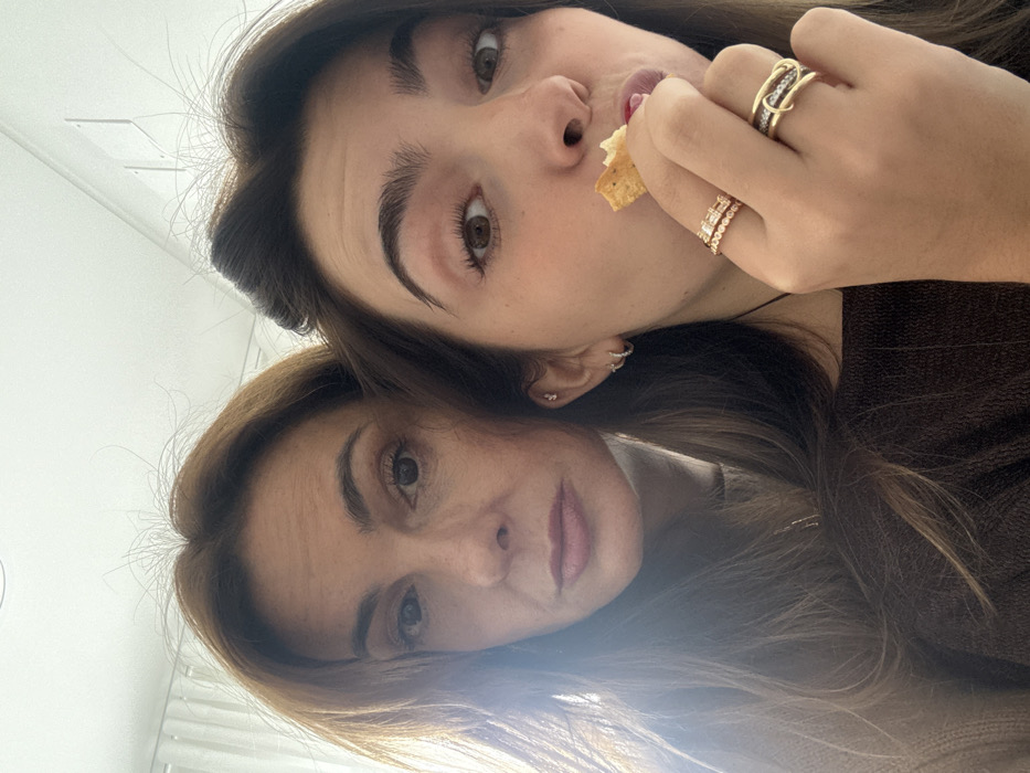 The image displays a close-up indoor portrait of two females. The exact location within the city of Torres Vedras, Portugal, cannot be determined from the visual information provided. On the left, an older female with long brown hair and visible facial lines on her forehead and around her eyes looks directly at the camera with a neutral expression. She wears a light brown or beige top. On the right, a younger female with long dark brown hair is partially visible in the foreground. Her eyes are wide, and her mouth is open, with her tongue slightly visible as she holds a piece of a light-colored, rectangular food item resembling a cracker or biscuit to her lips with her right hand. She wears a dark brown top. Her left ear displays a small stud piercing in the upper helix and two small hoop earrings in the lobe. Her right hand, holding the food, features three rings: an eternity-style band with small stones and a second gold-colored band with a textured design on her ring finger, and a wide gold-colored band with a knot-like design on her middle finger. The background is a bright, plain white wall. A window with light-colored curtains is faintly discernible in the upper left, behind the older female. Two small, rectangular light-colored fixtures, possibly electrical outlets or switches, are visible on the upper right wall behind the younger female.