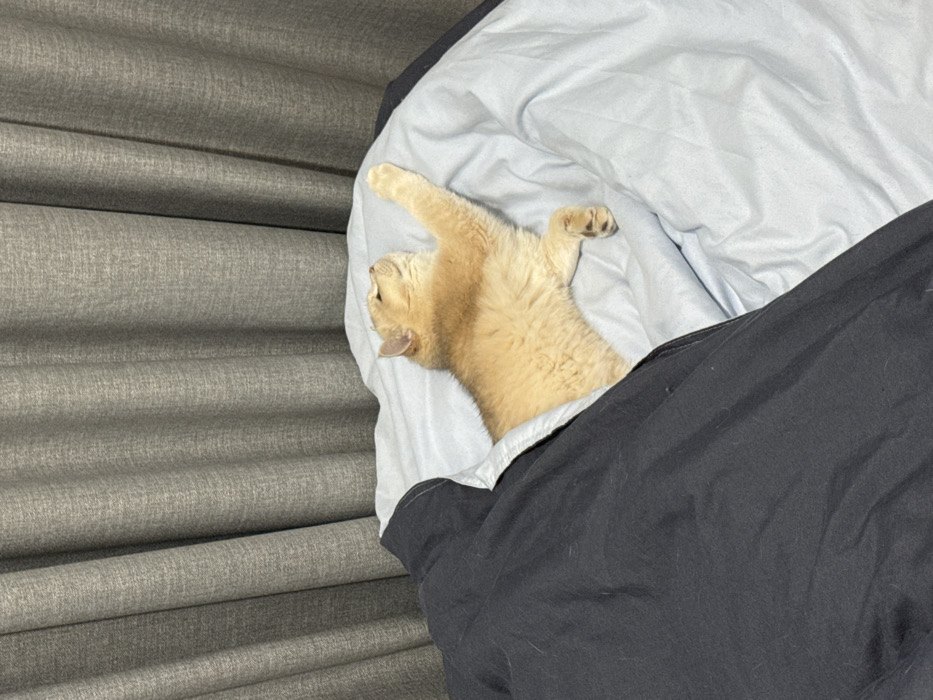 - "A domestic cat with golden-orange fur is observed resting or sleeping on its back within a bed" by FM-UFsim1, licensed under CC BY 4.0