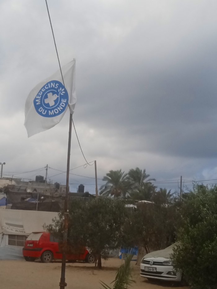 The image depicts an outdoor scene in Al-Mawasi, Palestinian Territories, under a heavily overcast sky. A white flag bearing the blue "Médecins du Monde" (Doctors of the World) logo, which features a cross and a dove holding an olive branch, flies on a dark pole in the left-center foreground. Overhead wires are visible, extending from the flag pole and other utility poles. The ground is unpaved, appearing sandy or dusty. In the midground, several olive-like trees and green foliage are scattered. To the left, a red two-door hatchback car is parked alongside a large white tent, which displays partially visible text, including "AID," suggesting a humanitarian aid structure. To the right, a white Volkswagen sedan is partially obscured by foliage; its Palestinian license plate, "B-1544-04," is discernible. The background reveals a cluster of low-rise buildings or makeshift structures, many equipped with black water tanks on their roofs. Numerous utility poles and intersecting overhead electrical wires are visible. Behind these structures, several palm trees are present. No people are visible in the scene.