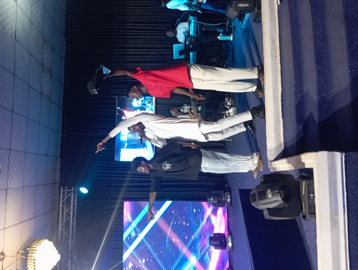 Three men stand on a stage. The man on top wears a red shirt and white pants, holding a black object. The middle man is in a white outfit, holding a microphone, with a screen behind him. The bottom man wears a dark shirt and light pants, pointing towards the audience. A large screen with colorful graphics is visible, and stage lighting illuminates the performers. A band plays in the background.
