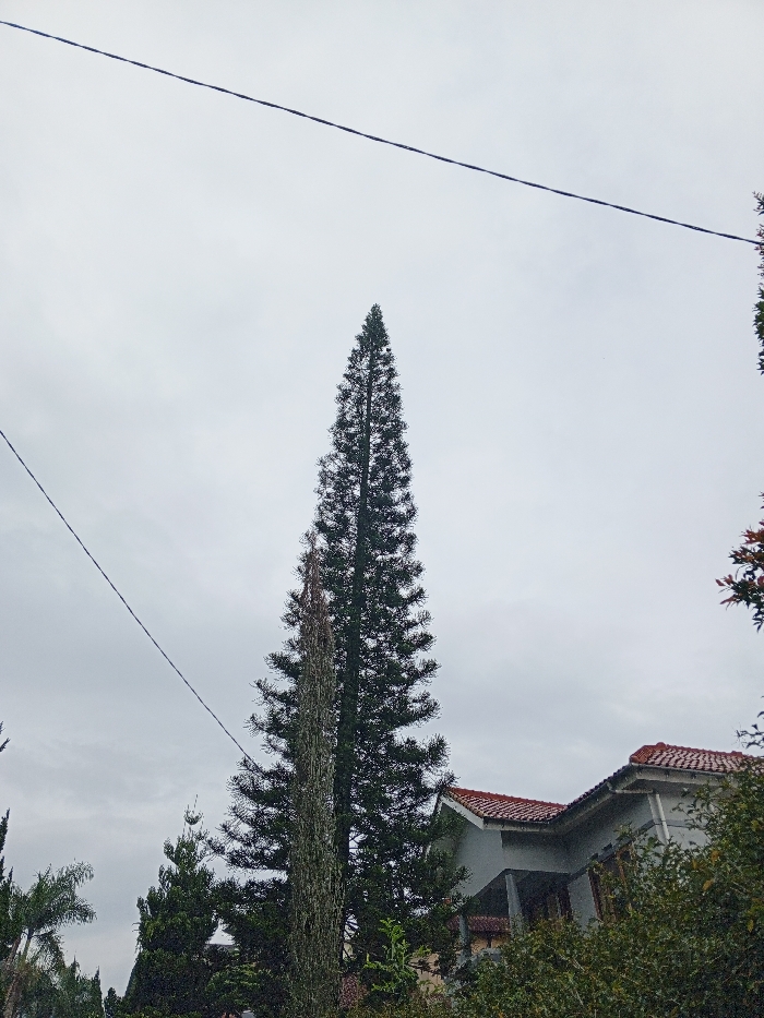 A tall, conical evergreen tree stands prominently against a cloudy sky. An electrical wire diagonally crosses the upper part of the image. The tree is situated near a building with a red-tiled roof and is surrounded by other trees and foliage. The scene appears to be outdoors on an overcast day.