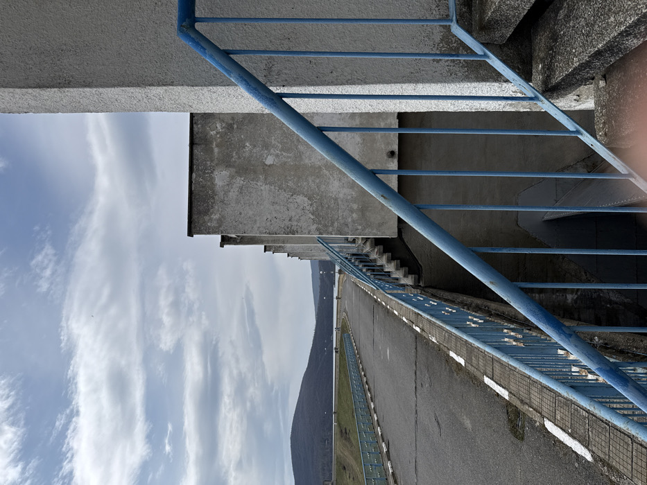 The image depicts an exterior scene at a dam or reservoir facility in Panicherevo, Bulgaria, under an overcast sky. In the foreground, a weathered blue metal handrail with vertical balusters extends diagonally from the lower right towards the mid-right, alongside concrete steps that ascend out of view to the right. The railing exhibits paint chipping and corrosion. Adjacent to this, a series of at least seven rectangular, concrete utility structures with flat, dark-trimmed roofs are visible, extending into the midground along the right side of the frame. These structures show significant surface weathering and discoloration. To the left of these structures, a paved asphalt road curves gently into the distance, bordered on its right by a strip of concrete pavers and white dashed lines. A second, identical blue metal railing runs along the left edge of this road, separating it from a sloping, grassy embankment. Beyond this embankment, a placid body of water, consistent with a reservoir, is visible. Distant streetlights are discernable along the far edge of the water. In the background, a range of dark, forested hills stretches across the horizon. The sky is predominantly covered with light grey and white clouds. No individuals or animals are present. A blurred, reddish object, consistent with a human finger, partially obscures the very bottom right corner of the image.