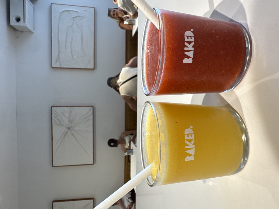 Two glasses of smoothies are on a white table, one red and one yellow, both with the word "BAKED" on them