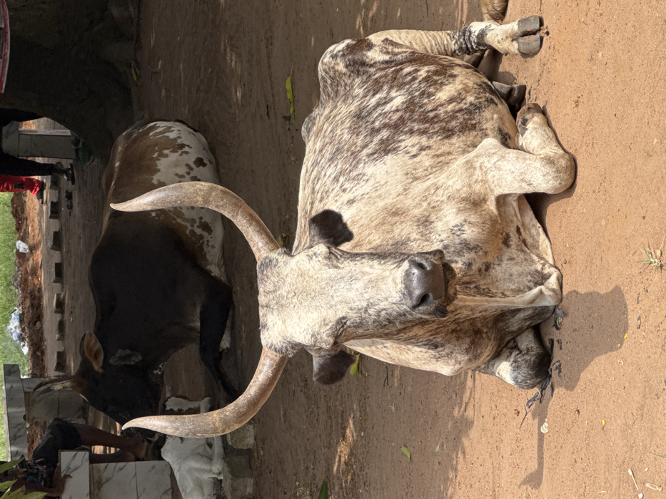 - "The image displays an outdoor scene in Ihiagwa, Nigeria, featuring two domestic bovines resting on a reddish-brown dirt ground under partial shade" by FM-mFVo23, licensed under CC BY 4.0
