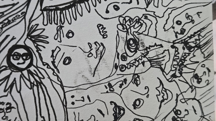- "The image is a close-up photograph of a black ink drawing on a light grey, textured paper surface" by FM-0J88a2, licensed under CC BY 4.0