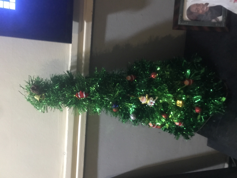 A miniature artificial Christmas tree sits on a black surface. It's decorated with ornaments including red balls, small gift boxes, and fish. The tree appears to be made of green tinsel. The tree is positioned near a white wall with some decorative molding. A framed photograph is visible in the upper right corner. A television screen is partially visible in the upper left of the photo.