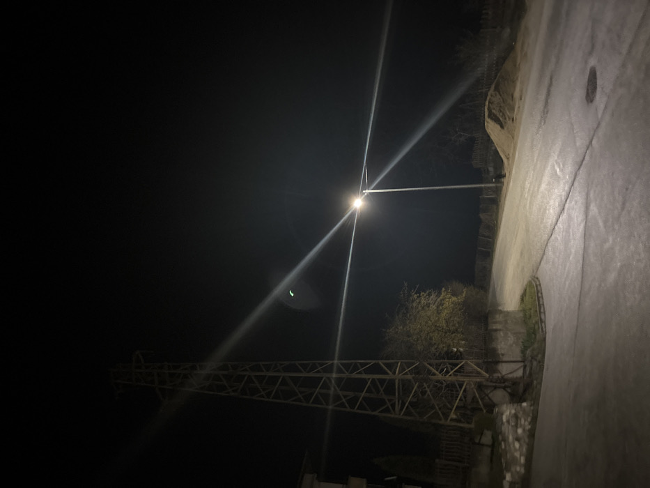 The image presents a nighttime scene in Grohotno, Bulgaria. The sky is dark and clear, featuring prominent lens flares originating from an artificial light source. A tall, metallic lattice transmission tower dominates the left side of the frame, with a partial view of a multi-story building situated behind it. To the right of the frame's center, a street light on a slender pole emits bright illumination, casting a cross-shaped lens flare and a distinct green, crescent-shaped flare higher in the dark sky. A paved asphalt road, exhibiting visible cracks and a circular manhole cover, curves from the foreground towards the background, illuminated by the street lamp. On the left, a low stone wall or curb borders the road, behind which a leafy, deciduous bush or small tree with some remaining foliage is present. On the right side of the road, a significant pile of light-colored sand or earth is visible, backed by a horizontal wooden fence and sparse, leafless trees or bushes. No individuals or animals are present within the depicted area.