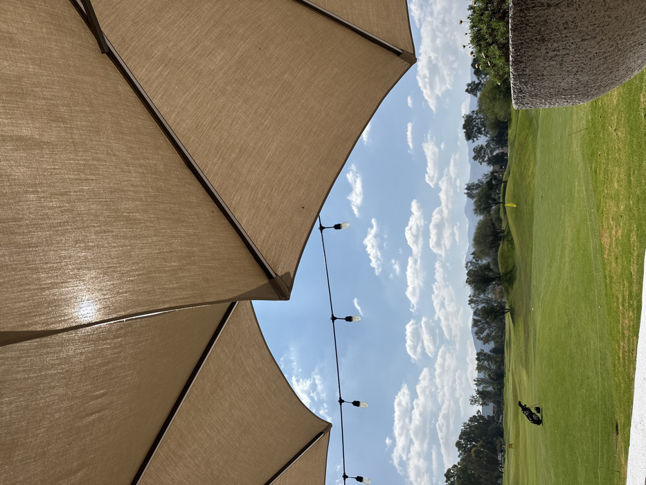 The photo features a partially visible beige patio umbrella and a string of lights. Beyond that, the background showcases a vibrant green golf course under a partly cloudy sky. Trees line the horizon, with distant mountains faintly visible. A golf cart and a flag are also seen within the golf course. A stone structure is on the right.