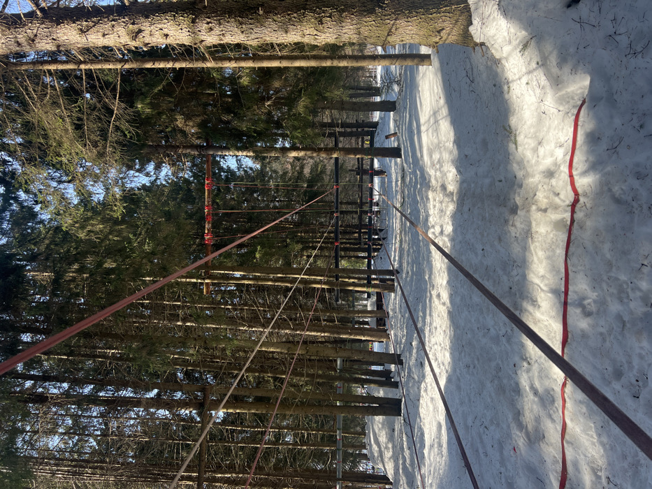 The scene depicts a snow-covered coniferous forest clearing in Сергино, Russia, under clear daylight conditions. No individuals are present. A complex outdoor rope and obstacle course is installed among numerous tall evergreen trees. Multiple red and dark-colored webbing straps are stretched horizontally at various heights, from ground level through the mid-canopy. Elevated wooden crossbeams, secured to trees, feature red rigging hardware supporting hanging ropes and additional horizontal course elements. In the background, further dark-colored obstacle structures, including platforms and interconnecting beams, are discernible. The forest floor is blanketed in snow, showing areas of both undisturbed accumulation and visible tracks or indentations.