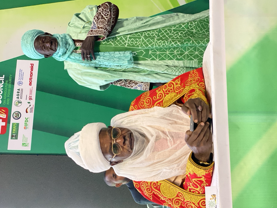 An indoor scene in Unguwar Sarki, Nigeria, features two adult males in traditional attire against a vibrant green backdrop. The backdrop displays the text "COUNCIL ON AGRICULTURE AND FOOD SECURITY" and logos for various organizations, including FMAFS, AGRA, IFDC, GIZ, ActionAid, and the UN Food and Agriculture Organization (FAO). In the foreground, an older male with a dark complexion, a short dark beard, and gold-rimmed eyeglasses is seated behind a white table. He wears a white turban that covers his face below the eyes, a white sheer shawl draped over his shoulders, and a prominent red robe with extensive gold embroidery. He is holding a dark grey smartphone in both hands, positioned over the table. A gold-colored bracelet is visible on his left wrist, and a ring with a reddish stone is on his right ring finger. Standing to the right and slightly behind the seated male is another older male, also with a dark complexion and visible facial wrinkles. He wears a light blue/teal turban, a matching patterned scarf around his neck, and a light green robe featuring geometric patterns. The sleeves of his robe have distinctive dark brown cuffs with intricate light-colored patterns. He wears a ring on his left ring finger and is looking towards the viewer. A small white card with a green stylized logo rests on the table to the left of the seated individual.