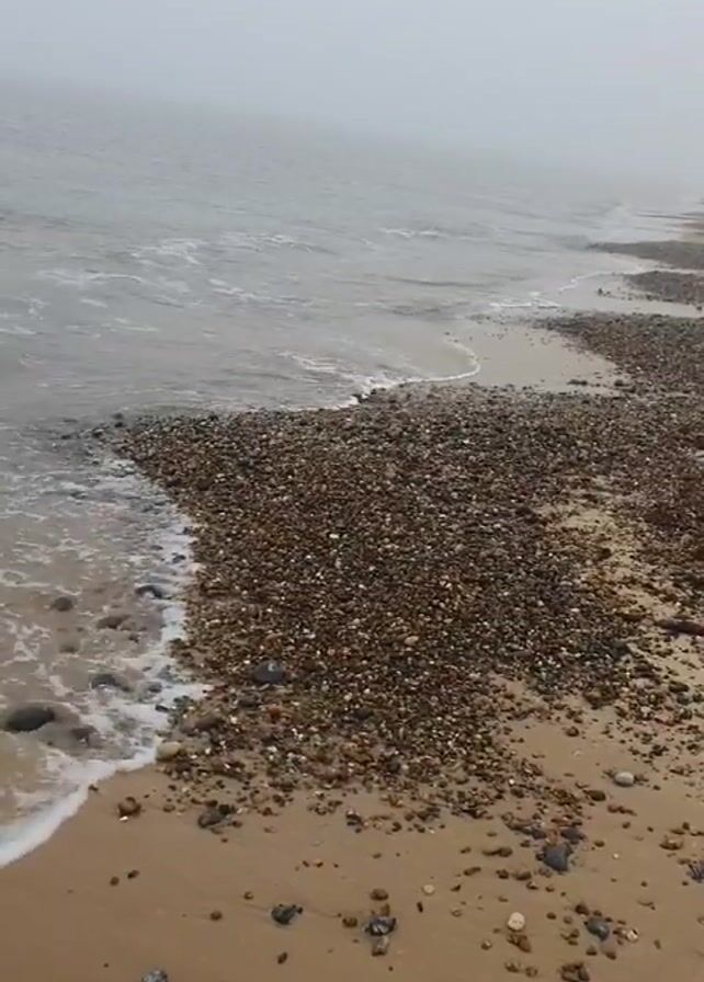 gray, misty beach scene. Waves gently lap at a shoreline composed of sand and a dense accumulation of small pebbles and rocks. The horizon is obscured by fog, creating a sense of a secluded and overcast environment. No people are visible.