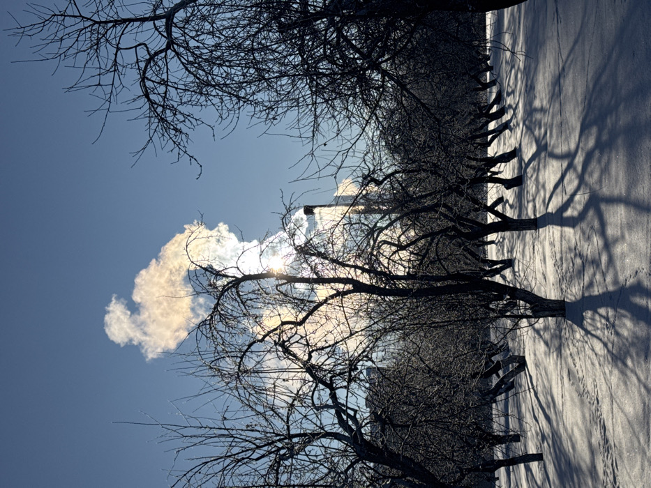 The image displays a winter landscape in Kronstadt, Russia. The foreground and midground are covered in a uniform layer of white snow, showing subtle depressions consistent with footprints. Numerous deciduous trees, stripped of leaves, are arranged in rows across the scene. Their dark, intricate branches form silhouettes against the sky. The trees cast long, distinct shadows across the snow, stretching from left to right, indicating a low sun position. In the background, a tall, slender industrial chimney or smokestack is partially visible through the bare tree canopy. Thick, white and off-white smoke or steam billows upwards from the chimney, illuminated brightly by the sun, which appears partially obscured behind the smoke and trees. The plumes exhibit iridescent coloration, including hues of yellow and orange. The sky above is clear and blue. No individuals or specific actions are discernible within the frame beyond the rising smoke.