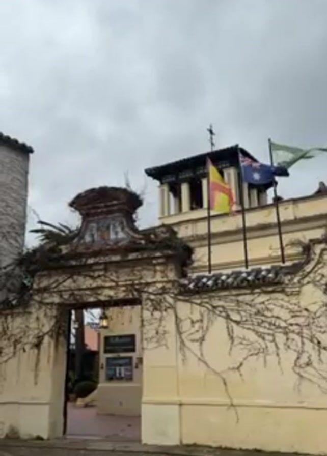 n exterior shot of a building on a cloudy day. The building has a stone tower and a wall with a gate. The wall is covered in vines. Three flags are flying on top of the building: the Spanish flag, the Australian flag, and the flag of Andalusia. A sign hangs inside the gate. The ground is paved with cobblestones. A person walks across the paved area.