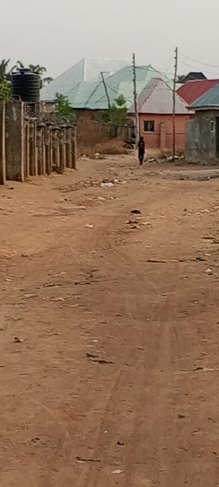 A forensic examination of a residential street in Nassarawa, Nigeria, reveals an unpaved, reddish-brown dirt road occupying the foreground and midground