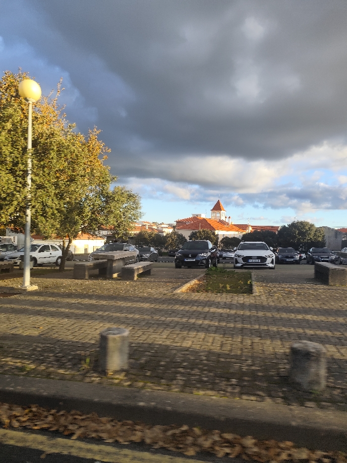 The image displays an urban outdoor scene in Fátima, Portugal, under a partially cloudy sky featuring both bright blue patches and large, dark grey cloud formations. The foreground consists of a paved surface with light brown/tan block patterns, with an asphalt strip along the very bottom edge covered in scattered dry brown leaves. Two out-of-focus cylindrical grey concrete bollards are present in the lower foreground. To the left, a tall metallic street light pole with a spherical yellow lamp is positioned beside a large tree exhibiting green and yellow-orange autumn foliage. In the midground, a grey concrete picnic table with a rectangular top and two attached benches sits on the paved area. Behind this, a parking lot contains multiple parked vehicles. Visible cars include a white hatchback on the far left, a black Seat Leon (license plate MM 63NN) parked slightly to the right of center, and a white Audi RS6 Avant (license plate AA 69 L S) prominently parked directly facing the viewer. Various other dark-colored cars are parked across the lot. The background features a collection of buildings with distinctive red-orange tiled roofs. A prominent building in the center-right background showcases a light-colored facade and a small tower with a conical red-orange tiled roof, topped with a finial. Scattered trees and bushes are visible throughout the background. No individuals are present in the scene. The lighting suggests late afternoon or early morning, with sunlight illuminating the foreground and parts of the distant structures from the left, casting shadows across the paved areas.