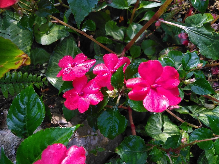 The image displays a close-up, vertical orientation of vibrant fuchsia-pink flowers and green foliage in Mouangkeo, Laos. Five primary flowers, likely Impatiens, are prominently featured, exhibiting five distinct petals and small water droplets on their surfaces. The flowers are interspersed among a dense arrangement of wet, glossy green leaves, including broad, dark green leaves of the flowering plant, fern-like fronds in the upper left, and variegated leaves with lighter patterns in the lower central area. Thin, reddish-brown stems are visible supporting the plant structures. The background consists of out-of-focus darker green foliage, indicating a lush outdoor environment. No human subjects or man-made objects are present. Natural lighting illuminates the scene, highlighting the moisture on the plant surfaces.