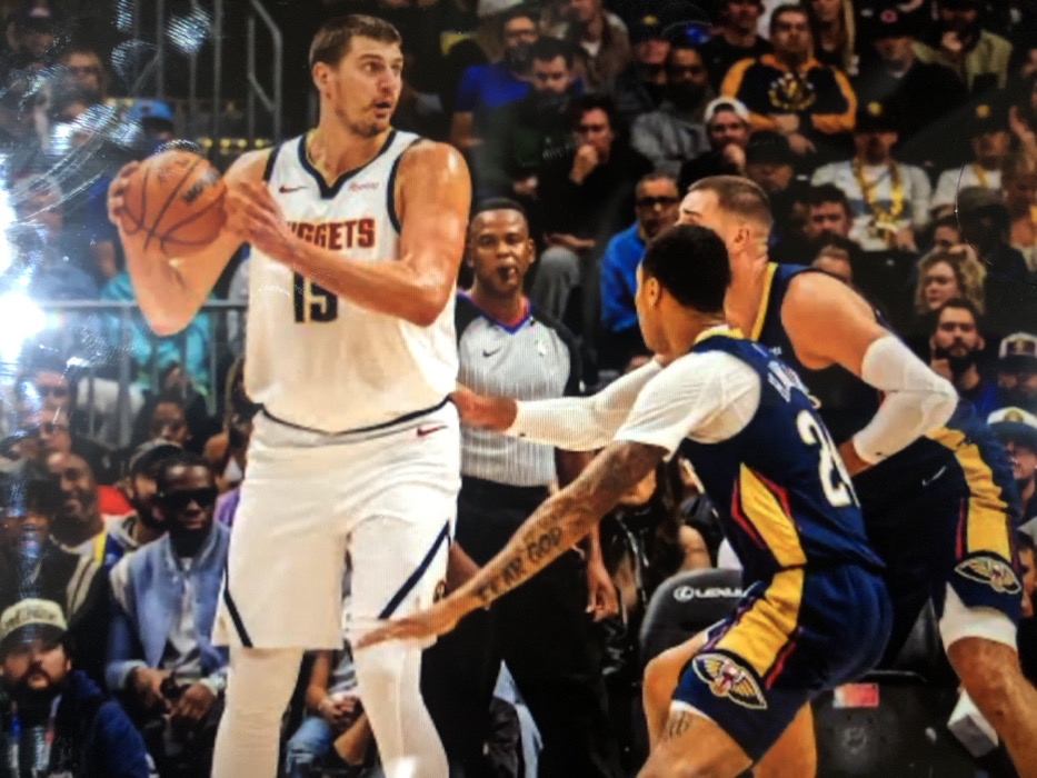 The image displays a basketball game in progress within an indoor arena, located in Kafr Sousa Municipality, Syria. Three primary male figures are visible on the court, engaged in play, with a referee observing nearby. In the center-right, a tall male athlete in a white jersey with the number "15" and "NUGGETS" emblazoned across the chest is holding an orange basketball overhead with both hands, positioned as if to shoot or pass. He has short brown hair and is looking towards the left side of the frame with a focused expression. To the left of him, another male athlete, wearing a dark blue and yellow jersey, is reaching upwards with his left arm extended towards the basketball. This player has a tattoo on his left forearm that reads "FEAR GOD". A portion of his back and right arm are visible, covered by a white sleeve or undershirt. A third player, also in a dark blue and yellow jersey with the number "23" visible on his back, is partially seen near the player with the tattoo. Beneath the central player in white, a male referee in a black and white striped shirt is looking towards the action. The background shows blurred rows of spectators in stadium seating, indicating a large audience. The lighting is bright, with a noticeable glare or reflection near the top center of the image.
