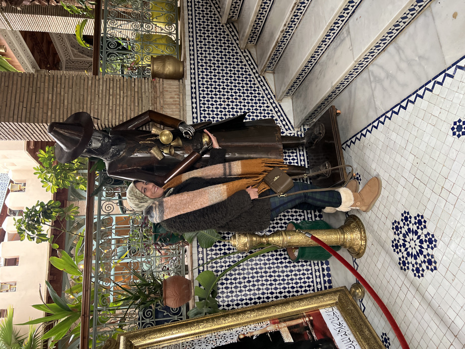A woman poses with a brass statue of a water seller, clad in a hat and traditional garb, complete with cups and vessels. The woman, smiling, wears a head covering, coat, and a patterned scarf. She's also wearing green and blue plaid patterned jeans and tan boots with a white furry lining. The scene is inside a building with tiled floors featuring geometric designs. Plants and ornamental ironwork are visible in the background. A golden stanchion with a red rope is in the foreground.