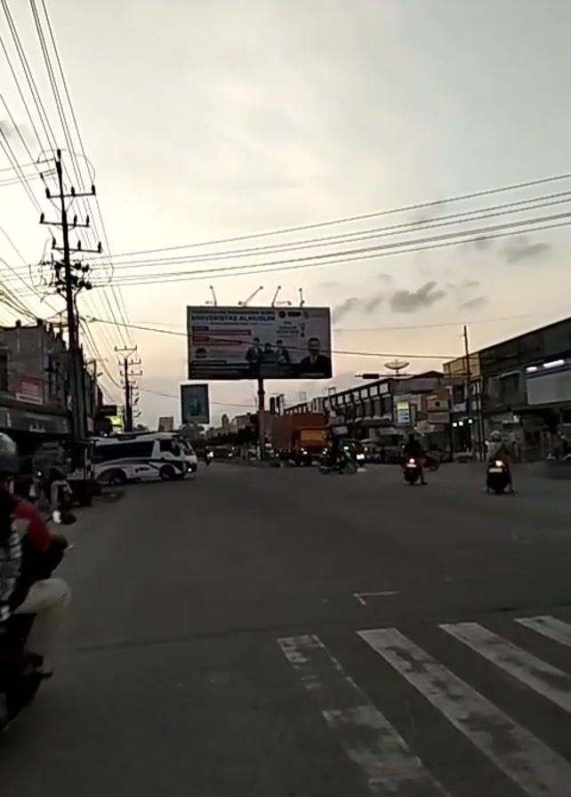 street intersection in a city, likely in Southeast Asia. It is dusk, with the sky a mix of pale blue and orange. Power lines crisscross overhead. A large billboard for "Universitas Almuslim" dominates the view above the intersection. Several motorcycles and a few cars and vans are visible on the road. Some people are walking or standing on the sidewalks. The scene suggests a typical urban environment with moderate traffic at the end of the day.