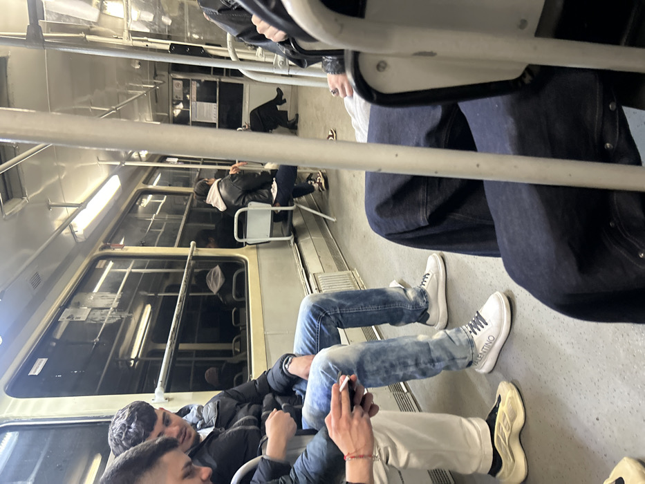 The image depicts the interior of a tram in motion within the city of Sofia, Bulgaria, likely during evening hours due to the visible reflections and interior lighting. The tram's design includes light-colored walls, large rectangular windows, and overhead fluorescent lighting fixtures. Metal poles are present for standing passengers. In the foreground, the lower half of an individual is visible on the far left, wearing light-colored trousers and beige sneakers with a ridged sole. This person is holding a black smartphone with both hands, positioned for viewing. Their left wrist displays multiple red string bracelets. Seated directly to their right is a young male with short, dark, curly hair and stubble, wearing a dark puffer jacket, faded blue jeans, and white sneakers with "VALENTINO" branding. He is looking down towards the smartphone held by the adjacent individual, appearing to observe or share in its use. Further into the tram, on the right side, a female passenger is seated facing away from the camera and towards the left. She wears a black leather jacket over a light-colored hoodie, with her dark hair pulled back. She occupies a seat with a white metal frame. Beyond her, indistinct figures are visible through the windows' reflections and in the further reaches of the tram, including another person seated with crossed legs, wearing a dark coat and dark boots. The overall scene indicates passengers engaged in transit during a routine commute.