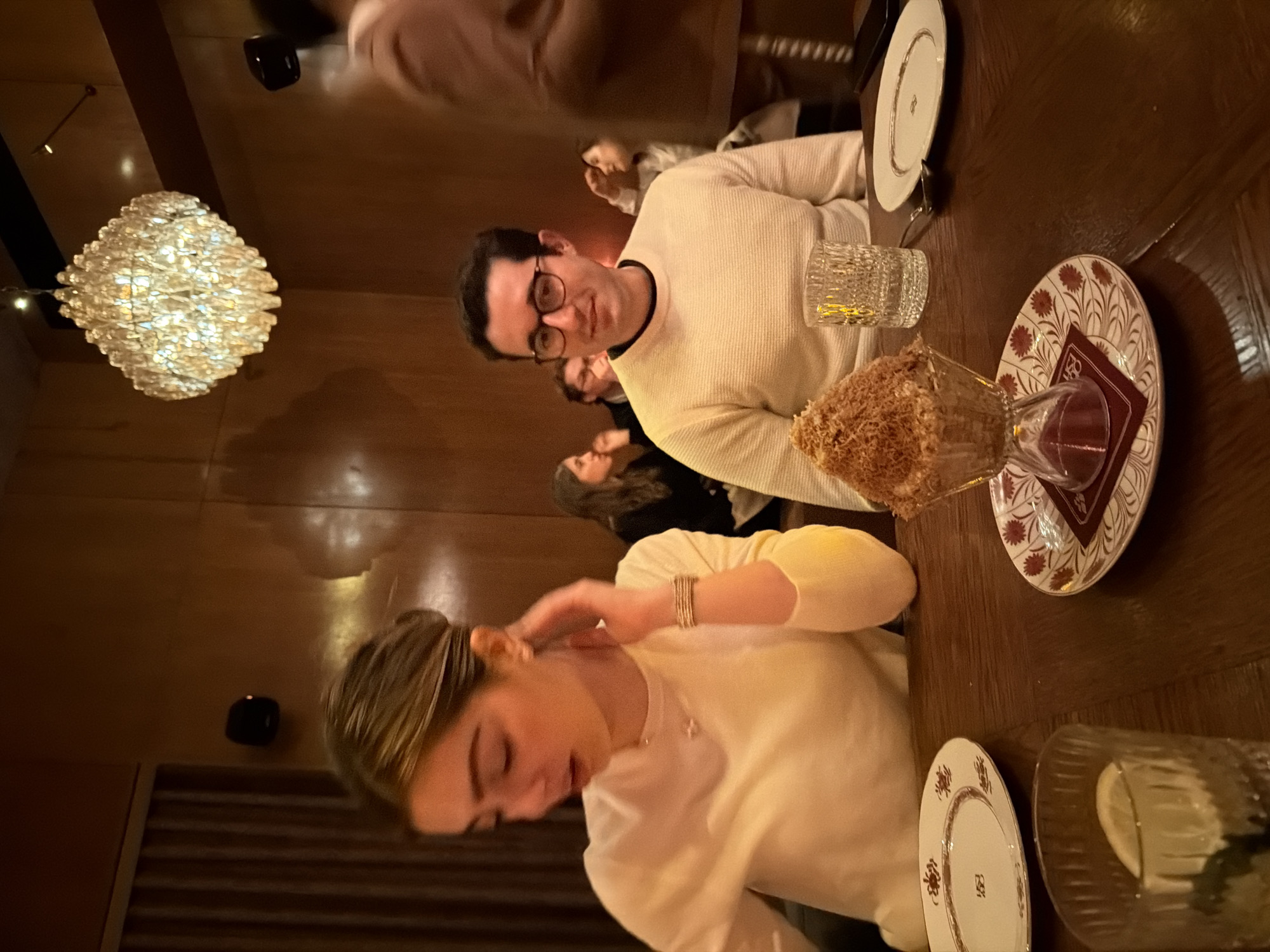 The image depicts a group of people at a table in a restaurant with dark wood furnishings