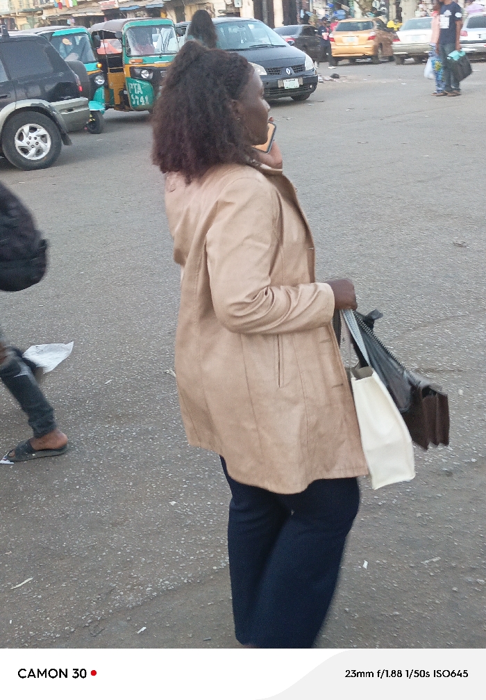 A woman with curly hair walks away while holding a phone to her ear. She wears a tan jacket and dark pants. In her other hand, she carries two bags, one white and one dark. She is standing on a paved road, with vehicles and other people in the background. A black SUV and a three-wheeled vehicle are visible in the left background. A black sedan is also present in the scene.