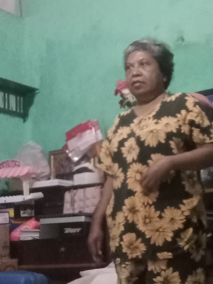 An older woman with short gray hair stands indoors. She wears a dark floral-patterned pajama set with yellow sunflowers. Behind her, against a green wall, is a cluttered shelf with various items including a mushroom-shaped lamp, boxes, and a framed picture. A partially visible window decoration is positioned high on the wall. The scene is softly lit, and the woman appears to be looking off to the side.