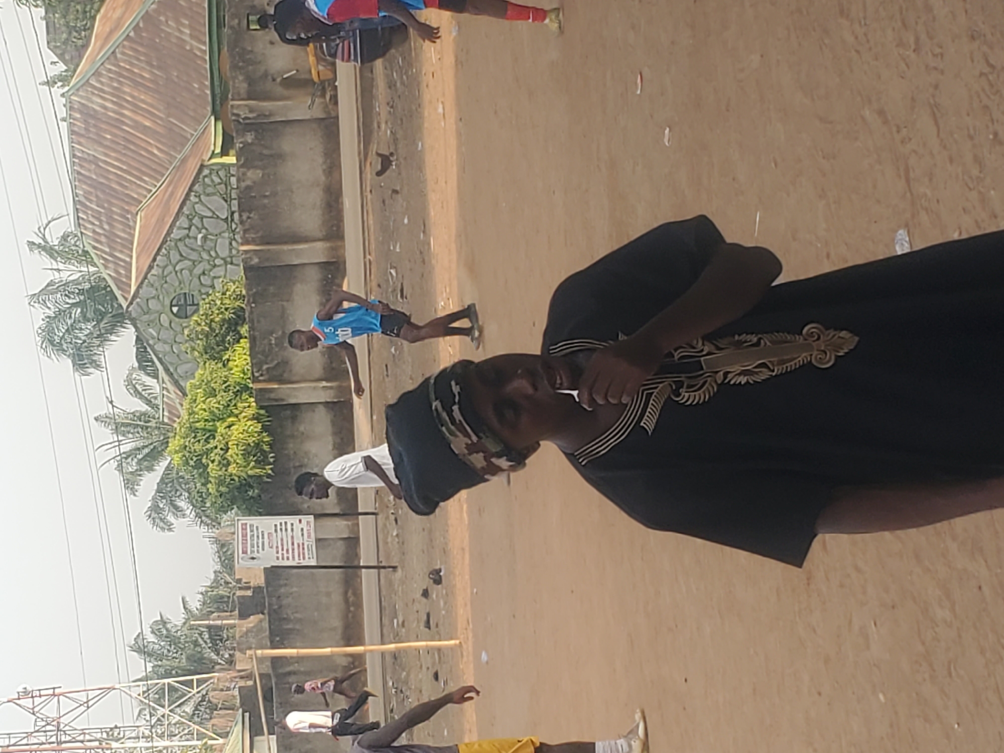 The image portrays an outdoor scene in Akwanga, Nigeria. In the foreground, a dark-skinned individual wears a black kaftan-style garment with gold embroidery and a black headwrap featuring a camouflage pattern. This person holds a small, white object to their mouth. The ground is unpaved, consisting of light-brown dirt littered with small white debris. In the midground, several young males are present. One male in a blue sleeveless jersey with the number "5" and "tb" printed on it, paired with black shorts, moves towards the right. Another male in a white t-shirt and dark pants walks rightward, positioned behind a light-colored wooden pole. A third individual, wearing yellow shorts and a grey top, is partially visible on the far left. On the far right, a person in a red and blue top and red shorts is partially visible. A dark-feathered chicken is visible on the dirt ground. A low, grey concrete wall runs horizontally across the midground, separating the unpaved area from a paved road. Behind the concrete wall, a white rectangular sign on a pole displays text and graphics. Further back, several buildings are visible, including one with a textured grey facade and a corrugated metal roof. Green foliage, including palm trees, is prominent in the background. A metal lattice tower and overhead power lines are visible on the left side of the background. A partially visible yellow vehicle is present behind the concrete wall on the right.