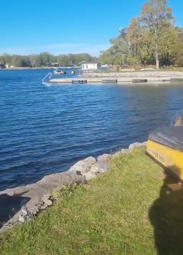 sunny day at a lake. The camera moves from an upside-down yellow canoe on a grassy bank, past rocky shoreline, over a concrete block, and along a wooden dock with a white metal ladder, finally focusing on the rippling blue water. Trees line the opposite shore, and several buildings are visible. Boats are docked in the distance. The sky is clear blue, with a few thin clouds appearing later. The only person visible is a shadow cast by the camera operator near the canoe.