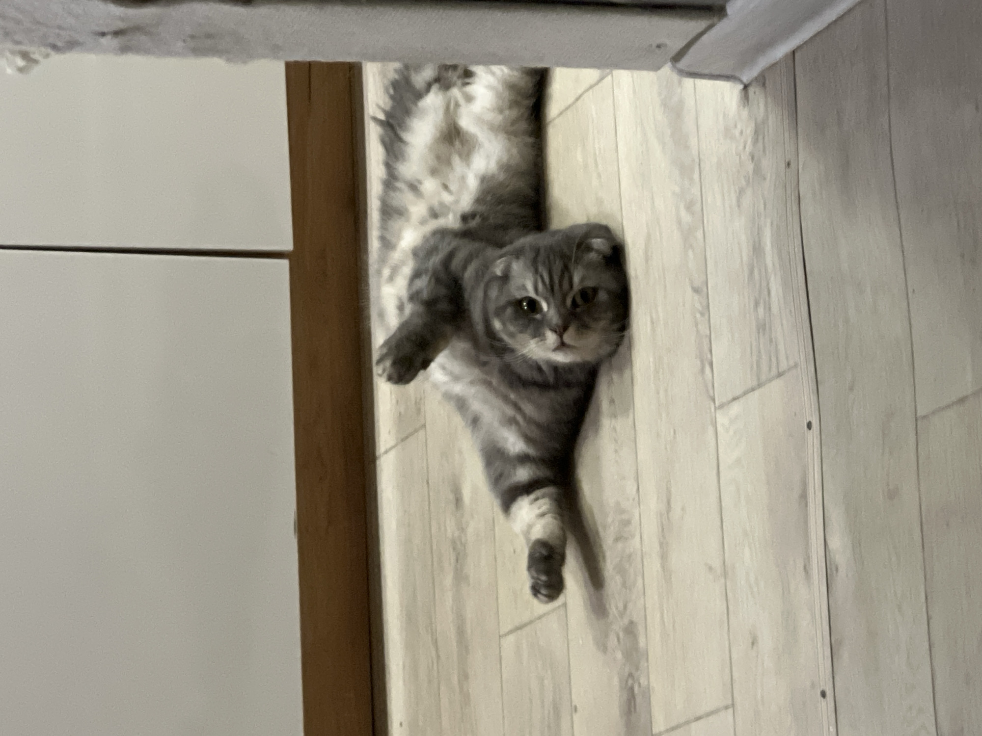 A single Scottish Fold cat, displaying grey tabby markings and a lighter ventral coat, is depicted lying supine on a light-colored, wood-effect laminate floor. The feline's head is tilted towards the viewer, its eyes open, and its front paws are elevated with hind legs extended. The immediate background comprises a lower section of two light-colored, unadorned cabinet doors above a wooden baseboard. A vertical white architectural element, likely a doorframe or wall edge, occupies the rightmost portion of the frame. The scene is located indoors within a domestic environment in Votkinsk, Russia.