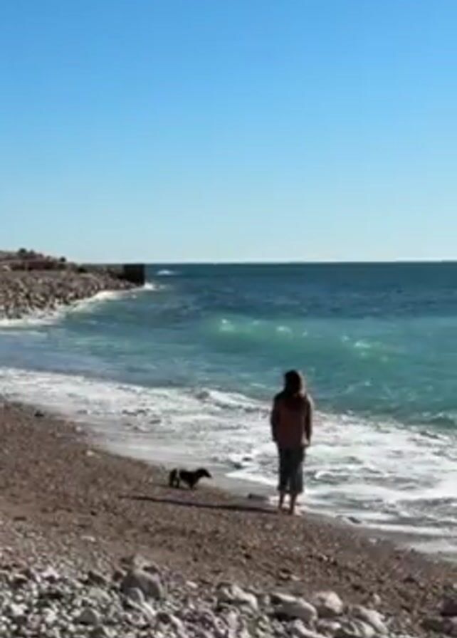A woman stands barefoot on a rocky beach near the water with a small black dog. The dog runs and plays around her feet. The waves break on the shore. The sky is clear and blue. Further along the beach, a breakwater extends into the sea. A building under construction with a crane is visible in the background. Another person sits on the beach further away.