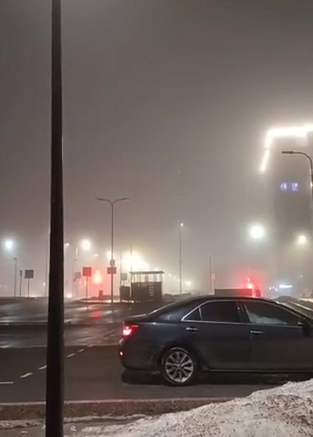 dark city street scene at night with heavy fog. Several streetlights are visible, casting a glow through the fog. A dark-colored sedan is parked on the side of the road. The building in the background is lit up with square lights. A car accelerates loudly and then quickly decelerates.