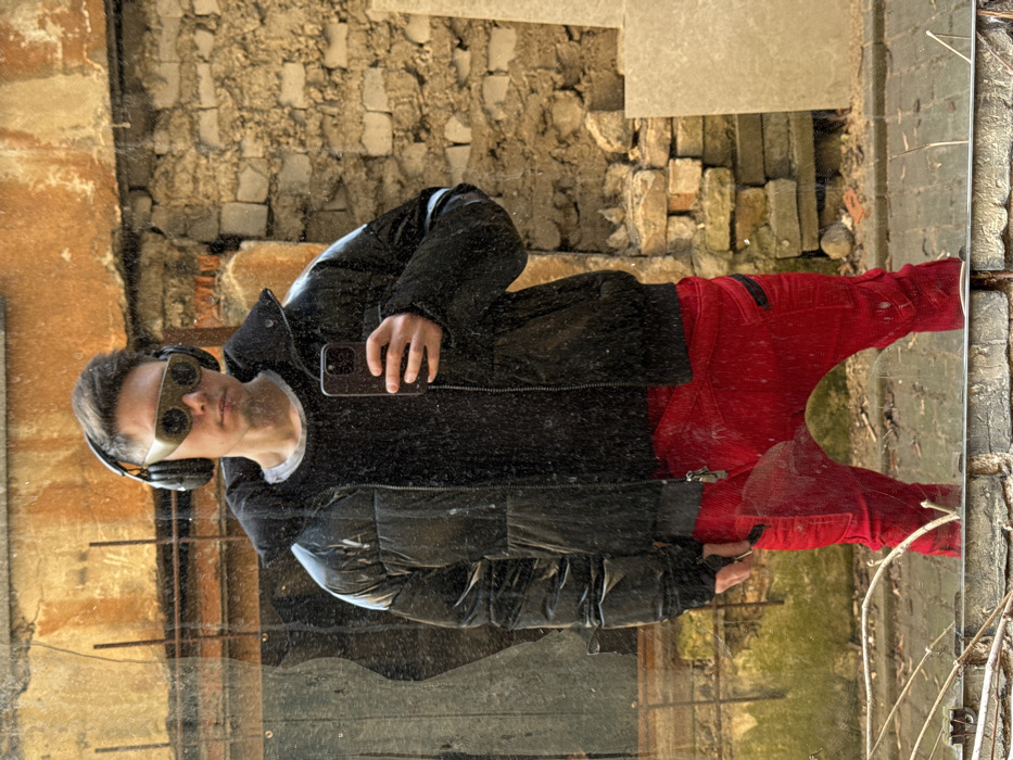 A male individual is captured in a full-body mirror selfie, holding a dark-colored smartphone in his right hand. He wears a light grey crew-neck t-shirt, a black zippered puffer jacket, dark over-ear headphones, and dark-framed, futuristic-style sunglasses with narrow horizontal lenses. His lower attire consists of bright red, baggy-fit pants with visible pocket details. The reflective surface itself is speckled with dust or debris. The background, visible through the mirror, consists primarily of a severely weathered brick wall featuring reddish-brown and tan bricks with exposed mortar and signs of decay. To the left, a darker, discolored wall is present. The ground level displays paving stones or concrete covered with sparse dry vegetation and debris. On the right side of the frame, several large, light-colored slabs are propped against the dilapidated brick wall. The setting's architectural elements and apparent urban decay are consistent with certain older, less maintained areas within the city of Vilnius, Lithuania, such as an aged courtyard or a forgotten urban pocket. The exact location beyond Vilnius, Lithuania, is not discernible.
