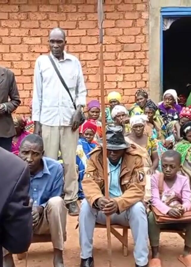 group of people gathered outdoors in what appears to be a village setting. A man in a black suit stands in front of a seated group, seemingly addressing them. The seated people are a mix of men, women, and a child, with the women wearing colorful headscarves and dresses. Some of the men are dressed in casual attire, while others wear jackets or blazers. Behind the seated group is a brick building with a blue door. A crowd of people stands on a slope behind the brick building. The setting suggests a formal gathering or community meeting in a rural area.