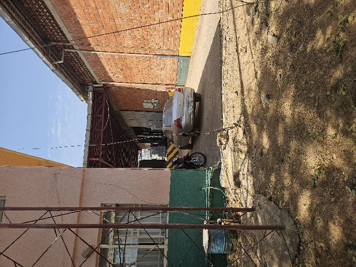 The scene depicts an outdoor alleyway or service road within Kakuri Gwari, Nigeria, under a clear blue sky. In the foreground, a light pink building with a dark green lower facade and a yellow upper trim is partially obscured by a weathered metal support structure comprising three vertical poles and diagonal cross-bracing. A multi-pane window is visible on the pink building's facade. At the base of this building, a rusted blue metal drum rests on the ground. A silver sedan, oriented with its rear facing the viewer, is parked on a paved section of the alleyway. To its immediate left, a black motorcycle is visible. The paved surface extends into a covered section of the alley, marked with yellow and black diagonal hazard stripes on the ground. To the right, a building constructed of red brick with a yellow-painted base features a corrugated metal roof and a gutter system. Overhead, metal trusswork supports the roof structure covering the alley. Further down the alley, industrial materials and another vehicle are partially visible in the background. The immediate ground surface consists of dry dirt with sparse vegetation and numerous shadows. No individuals are visible within the frame.