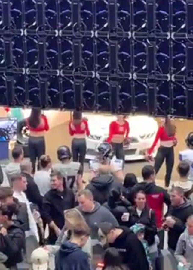The video captures a lively scene with a crowd of people gathered around a display featuring four women dressed in red crop tops and black leggings, performing a dance routine. They are positioned in front of a white car. Several men dressed in football jerseys are visible within the crowd. Overhead, a large grid of black components hangs from the ceiling. The overall setting appears to be a trade show or public event, based on the presence of the display and the number of attendees. The dance performance seems to be an attraction, drawing attention from the surrounding crowd.
