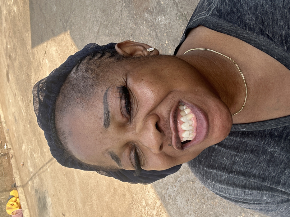 A close-up, outdoor portrait captures an adult female, likely of African descent, with a highly animated facial expression