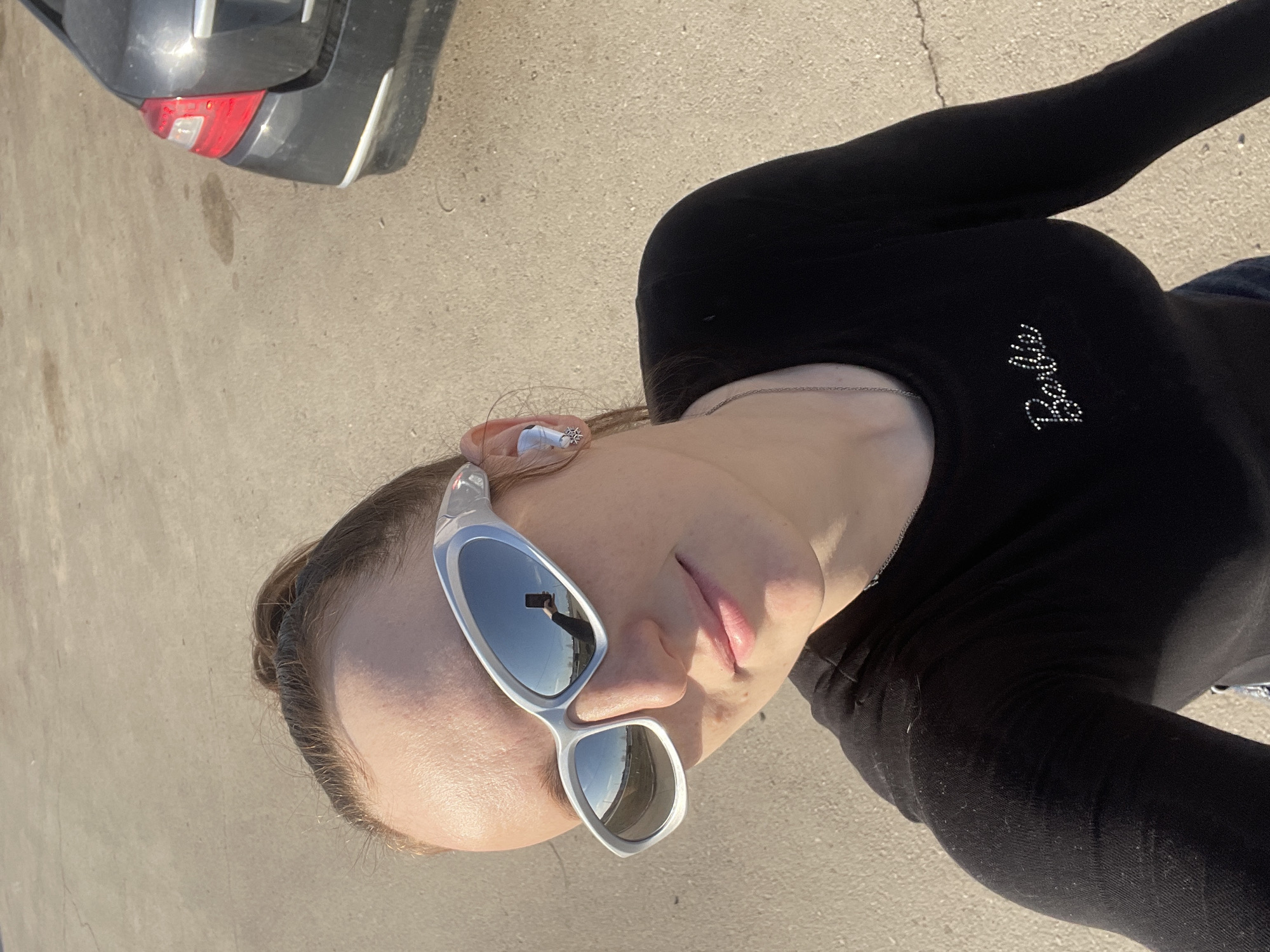 A fair-skinned person is captured from a low-angle perspective, possibly a self-portrait. The person is wearing silver-rimmed sunglasses that reflect the sky and surrounding environment. The person is also wearing a black, form-fitting top with the word "Barbie" spelled out in rhinestones on the upper chest. A delicate silver chain is visible around the person's neck. The person also has a piece of jewelry visible on their ear. The background is a neutral concrete surface. A portion of the taillight of a dark-colored vehicle is visible in the upper left corner of the image. Based on the landscape and the taillight from a Lada car, it is likely the picture was taken in Подстёпки, Russia.