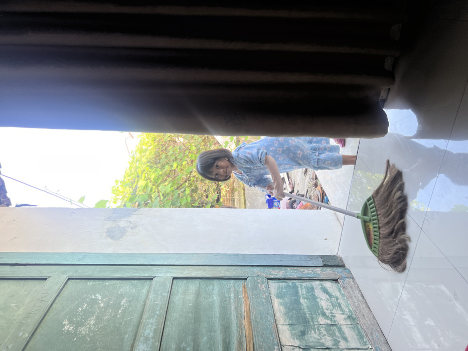 A young girl in a blue floral dress sweeps a tiled floor with a broom. The floor is partially visible under a brown curtain. The girl is looking towards the camera. A white wall with a weathered green door is in the foreground. Behind the wall, there is foliage.