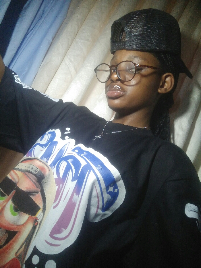 An indoor, close-up portrait features a young female subject. She possesses a dark complexion, wears a black mesh trucker cap reversed on her head, and round, tortoiseshell-patterned eyeglasses. Her lips are visibly glossy. She is adorned with a thin silver chain necklace featuring a small cross-shaped pendant. Her attire includes a black long-sleeved t-shirt with a prominent graphic print on the chest, depicting a stylized cartoon character with a headband, rendered in white, blue, and purple hues. Her braided hair is visible extending from beneath the cap. The subject's head is slightly tilted, and her gaze is directed upwards and to the right of the frame, not at the camera. Her left arm is extended out of frame, consistent with holding a device for a self-portrait. The background consists of vertically draped fabric, appearing to be curtains or bedding, displaying sections of light blue transitioning to cream or light beige. The precise location within Badore, Nigeria, is not ascertainable from the visual information provided.