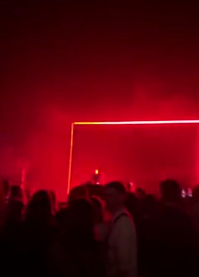 music event with a crowd of people in a dark room. The stage is illuminated by a large red rectangular light. A DJ can be seen performing behind the light.